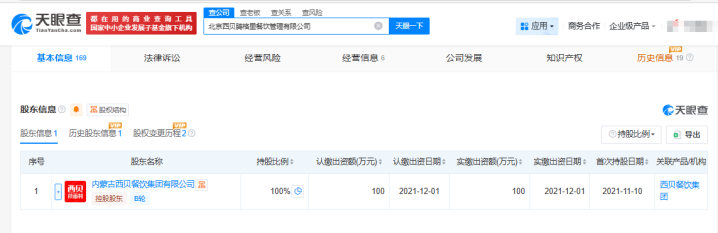 天眼查APP显示,北京西贝腾格里餐饮管理有限公司成立于2021年,控股股东为贾国龙担任法定代表人、实际控制人的西贝,持股比例为100%。
