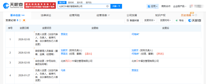 除卸任西贝CEO外,贾国龙此前还曾退出西贝旗下一餐饮管理公司。天眼查App显示,2月5日,北京西贝小牛餐饮管理有限公司发生工商变更,企业名称变更为北京贝牛餐饮管理有限公司,贾国龙卸任法定代表人,由何海宾接任。这距离1月27日贾国龙担任该公司法定代表人不足两周,1月27日,北京贝牛餐饮管理有限公司曾发生工商变更,马燕卸任法定代表人,由贾国龙接任。